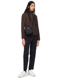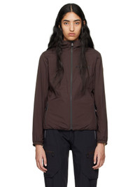 Packable stretch nylon ripstop jacket. Lightweight, breathable, water-repellent, and windproof. · Partially elasticized hood · Stand collar · Zip closure · Logo bonded at chest · Zip pockets · Elasticized hem and cuffs · Embroidered logo patch at sleeve · Text printed at back hem · Patch pocket at interior · Full polyester mesh lining Part of the Day-Namic collection. Supplier color: Dark brown Body: 85% polyamide, 15% elastane. Lining: 100% polyester. Made in Romania 242826F063003