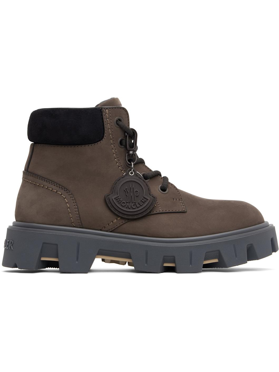 Ankle-high nubuck and suede boots. · Detachable logo tag at lace-up closure · Logo embossed at padded tongue · Padded collar · Buffed leather lining · Treaded rubber sole Supplier color: Peat Upper: leather. Sole: rubber. Made in Italy 252111M255002