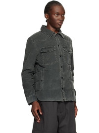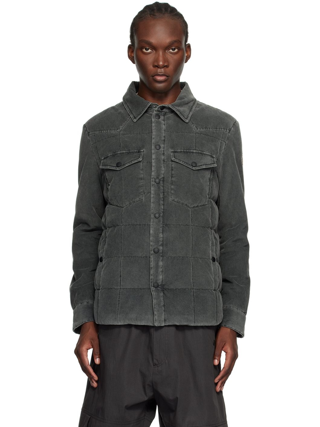 Lightweight DIST-certified down-filled cotton corduroy jacket. · Spread collar · Press-stud closure · Flap and welt pockets · Embroidered logo patch at sleeve · Eyelet vents at armscyes · Adjustable single-press-stud barrel cuffs · Zip pocket at interior · Full nylon micro ripstop lining Part of the Apres-Ski collection. Supplier color: Grey Fill: 90% down, 10% feather. Body: 100% cotton. Trim: 100% polyester. Lining: 100% polyamide. Made in Romania 242826M178003