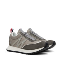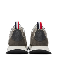 Low-top lightweight suede, buffed leather, and quilted nylon taffeta sneakers in gray. · Lace-up closure · Pull-loop at padded tongue and heel tab · Padded collar · Logo applique at sides and heel counter · Mesh lining · TPU foam rubber midsole · Treaded rubber sole Supplier color: Grey Upper: textile, leather. Sole: thermoplastic polyurethane, rubber. Made in Viet Nam 242111M237013