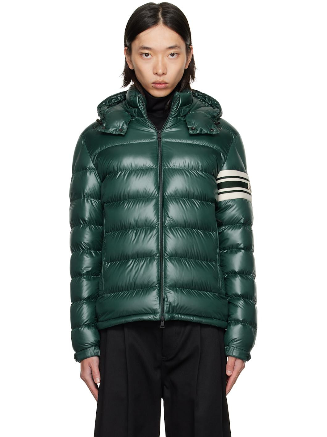 Quilted down-filled satin jacket. · Detachable hood · Stand collar · Two-way zip closure · Zip pockets at waist · Knit sleeve cuff with embroidered logo · Adjustable press-stud cuffs · Zip pocket at interior · Satin lining Supplier color: Sea moss Fill: 90% down, 10% feathers. Body: 100% polyester. Made in Romania 252111M178033