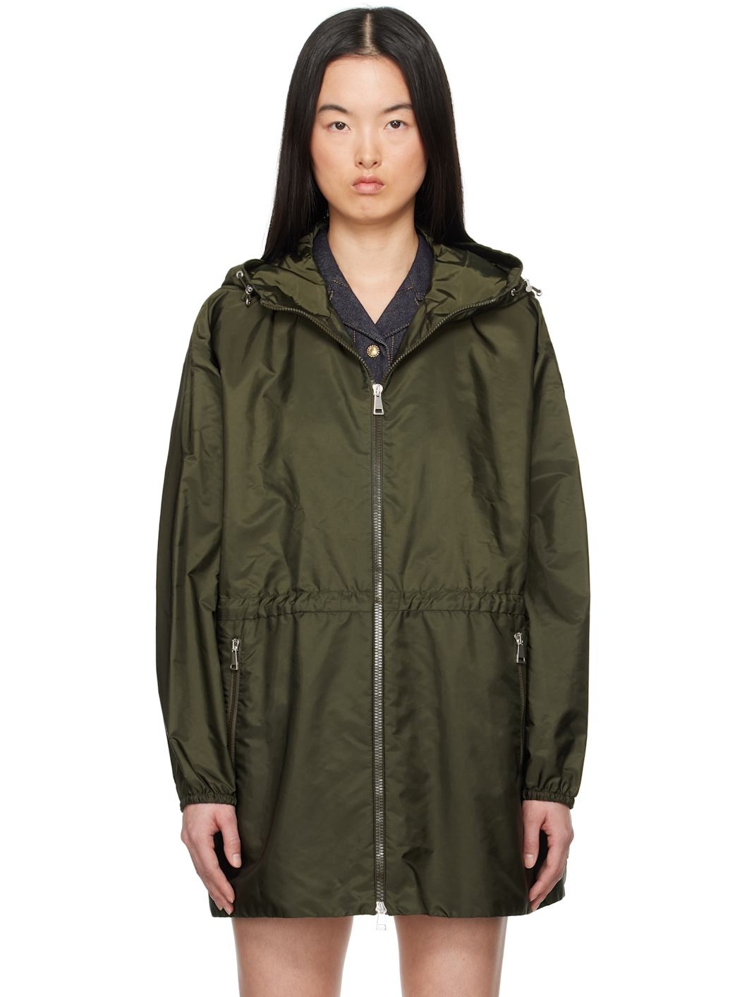 Water-repellent recycled nylon taffeta jacket. · Bungee-style drawstring at hood and pleated back · Stand collar · Two-way zip closure · Zip pockets · Embroidered logo patch at sleeve · Elasticized cuffs · Partially lined · Logo-engraved silver-tone hardware Supplier color: Green 100% recycled polyamide. Made in Moldova 251111F063053