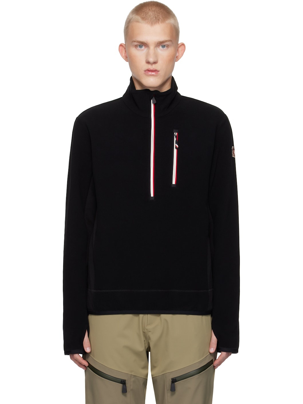 Insulated stretch polyester fleece jacket. Windproof, water-repellent, breathable, and lightweight. · Stand collar · Half-zip closure · Zip pocket · Elasticized hem and cuffs · Embroidered logo patch at sleeve · Thumbhole at cuffs Supplier color: Black Body: 93% polyester, 7% elastane. Trim: 93% polyester, 7% elastane. Made in Italy 242826M202000