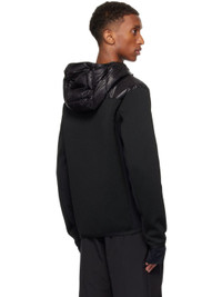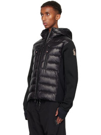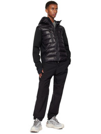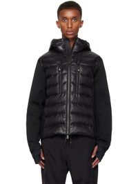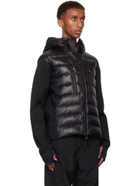DIST-certified down-filled and quilted nylon laque, polyester jersey, and knit stretch polyester-blend jacket. Breathable and lightweight. · Paneled construction · Webbing trim at hood · Two-way zip closure · Zip pockets · Elasticized curved hem and cuffs · Embroidered logo patch at sleeve · Thumbhole at inset jersey cuffs · Partial ripstop and fleece lining Part of the Apres-Ski collection. Supplier color: Black Fill: 90% goose down, 10% feather. Body 1: 100% polyamide. Body 2: 100% polyester. Body 3: 100% polyamide. Trim: 55% polyester, 34% polyamide, 11% elastane. Lining 1: 100% polyester. Lining 2: 100% polyester. Made in Romania 242826M178007