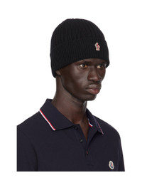 5-gauge rib knit virgin wool beanie in black. Embroidered logo patch at rolled brim. Part of the Apres-Ski collection. Supplier color: Black 100% virgin wool. Made in Italy 242826M138005
