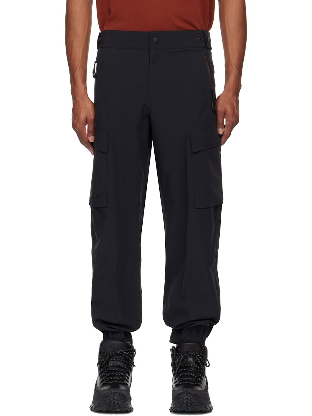 Plain-woven stretch nylon cargo pants. Lightweight, breathable, windproof, and waterproof. · Adjustable press-stud tabs at partially elasticized waistband · Two-pocket styling · Zip-fly · Creased legs · Elasticized cuffs · Cargo pocket and darts at outseams · Rubberized logo applique at pocket · Reflective logo printed at back waist Part of the Day-Namic collection. Supplier color: Black 81% nylon, 19% elastane. Made in Romania 242826M188001