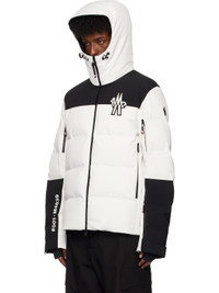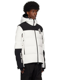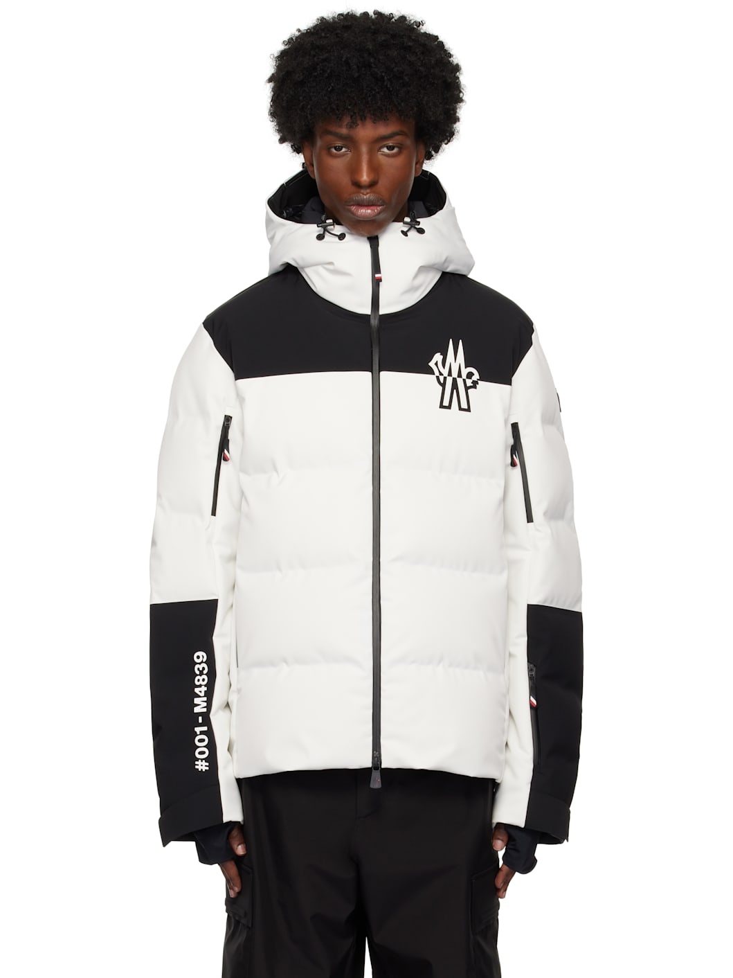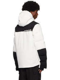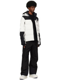 DIST-certified down-filled stretch polyester taffeta jacket. Waterproof, windproof, lightweight, and breathable. · RECCO® rescue reflector · Colorblock construction · Bungee-style drawstring at hood · Stand collar · Two-way zip closure · Logo bonded at chest and back · Zip pockets · Zip vent at sleeves · Rubberized logo patch at sleeve · Velcro tab at cuffs · Thumbhole at inset jersey cuffs · Zip pocket at interior · Snow skirt at interior · Full taffeta lining Supplier color: Ice Fill 1: 90% goose down, 10% feather. Body: 87% polyester, 13% elastane. Trim: 85% polyamide, 15% elastane. Fill 2: 100% polyester. Lining 1: 85% polyamide, 15% elastane. Lining 2: 100% polyamide. Made in Romania 242826M178020