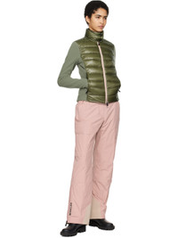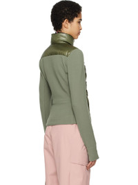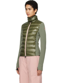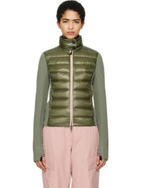 Quilted and down-filled nylon ripstop and stretch polyester fleece jacket. Lightweight, windproof, and water-repellent. · DIST-certified down · Paneled construction · Press-stud fastening at funnel neck · Piping at two-way zip closure · Zip seam pockets · Stretch jersey panel at sides and sleeves · Embroidered logo patch at sleeve · Thumbhole at cuffs · Partial taffeta lining Supplier color: Sage Fill 1: 90% goose down, 10% goose feather. Fill 2: 100% polyester. Body 1: 93% polyester, 7% elastane. Body 2: 100% nylon. Body 3: 93% polyester, 7% elastane. Body 4: 75% nylon, 25% elastane. Lining: 100% polyester. Made in Romania 242826F061014