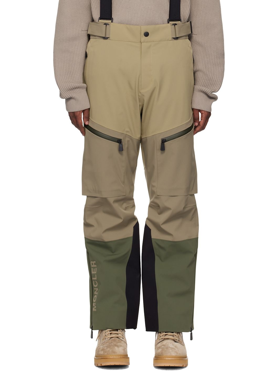 PrimaLoft®-insulated stretch nylon twill ski pants. Windproof, waterproof, breathable, and lightweight. · Integrated RECCO® rescue technology · Paneled construction · Velcro tabs at waistband · Adjustable logo-woven elasticized suspender straps · Four-pocket styling · Zip-fly · Darts at knees · Logo bonded at leg · Zip vent at cuffs and outseams · Inset elasticized cuffs · Rubberized logo flag at back waistband · Partial brushed jersey and satin lining Supplier color: Khaki green Body: 87% polyamide, 13% elastane. Lining 1: 92% polyester, 8% elastane. Lining 2: 100% polyester. Lining 3: 100% polyamide. Made in Romania 242826M191003