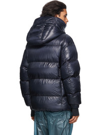 Long sleeve down-filled quilted technical ripstop coat in navy. Bungee-style drawstring at hood. Concealed zip closure with Velcro placket at front. Flap pockets and zippered pockets at waist. Detachable embroidered logo patch in black with Velcro fastening. Adjustable press-stud tab and thumb opening at integrated bonded jersey cuffs. Zippered pocket at interior featuring headphone wire opening. Integrated adjustable harness in black at interior with press-release buckle fastening. Supplier color: Blue Fill: 90% goose down, 10% feathers. Body: 100% polyester. Made in Romania 202826M178008