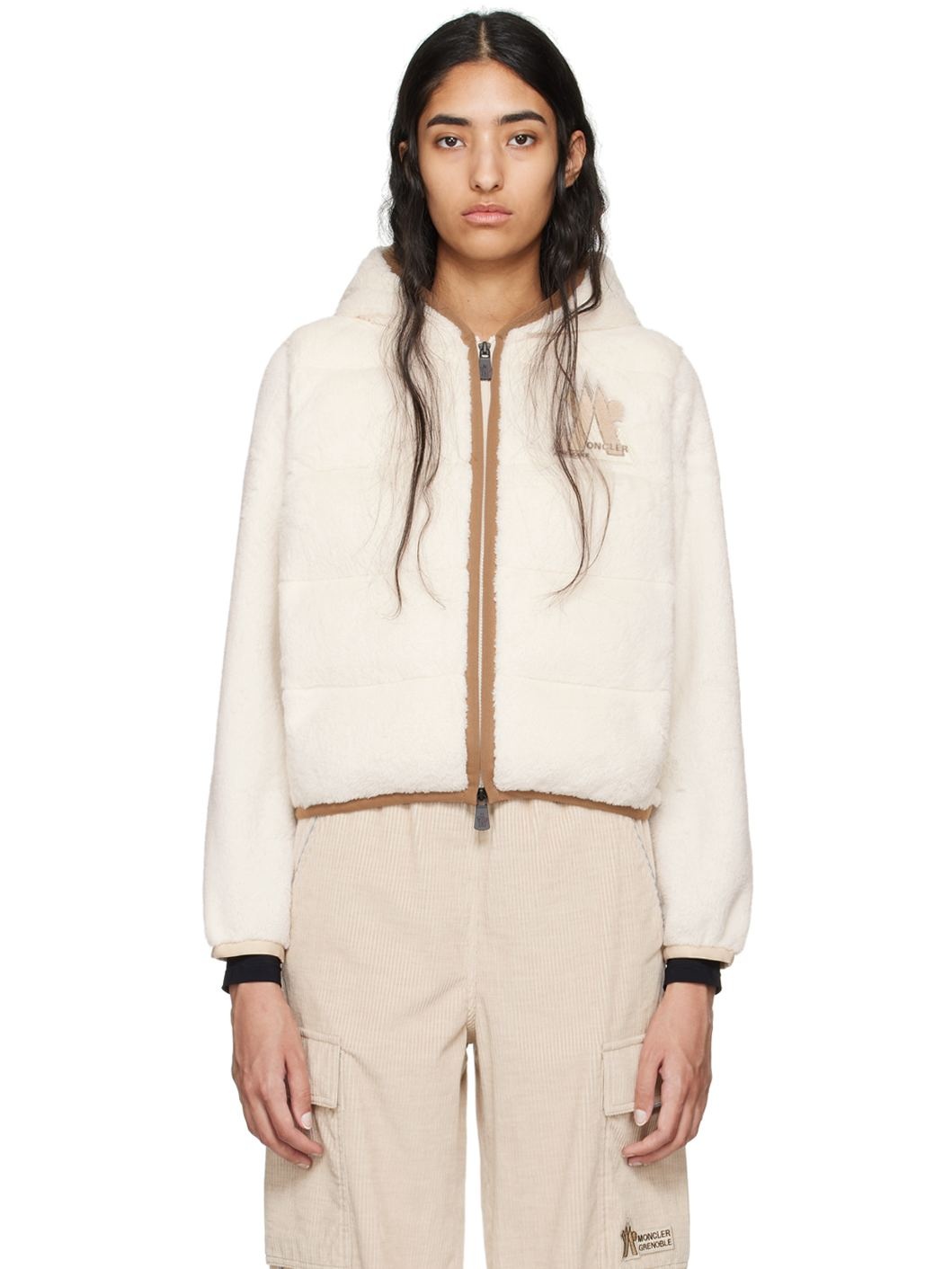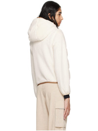 Packable down-filled and quilted stretch polyester sherpa fleece jacket. Lightweight, breathable, quick-drying, and thermo-regulating. · Partially elasticized hood · Two-way zip closure · Boucle logo patch at chest · Welt pockets · Elasticized hem and cuffs · Partial nylon laque lining Supplier color: White Fill: 90% goose down, 10% feather. Body: 97% polyester, 3% elastane. Lining: 100% polyamide. Made in Bulgaria 242826F061001