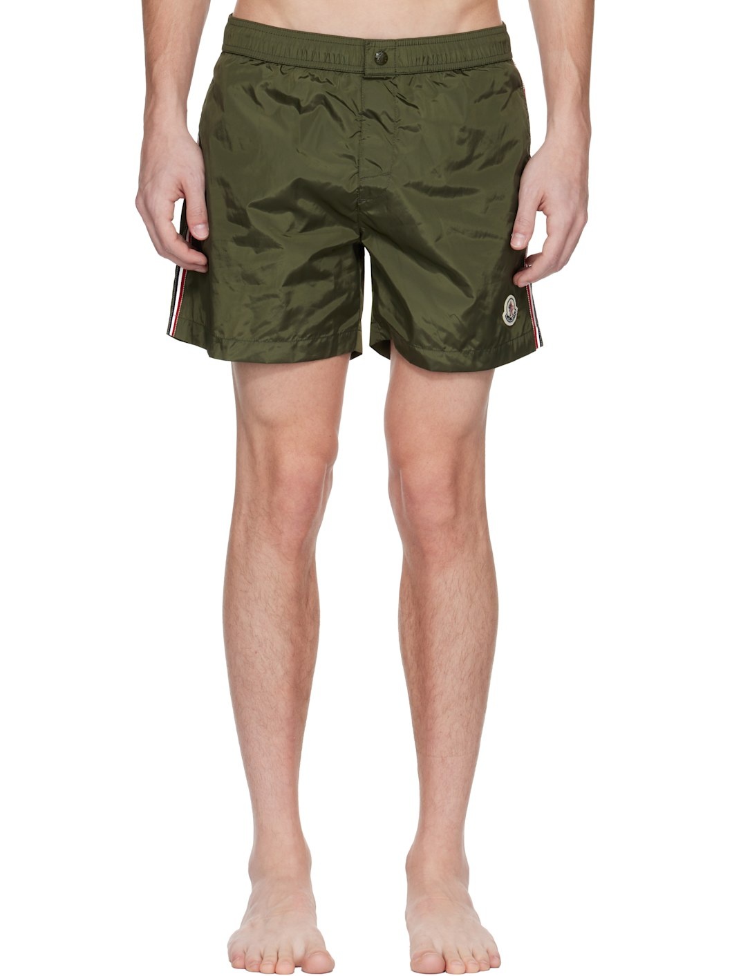 Nylon taffeta swim shorts. · Concealed drawstring at elasticized waistband · Three-pocket styling · Velcro fly · Felted logo patch at leg · Stripes at outseams · Full brief-style mesh lining Supplier color: Olive Body: 100% polyamide. Lining: 100% polyamide. Made in Albania 251111M208011