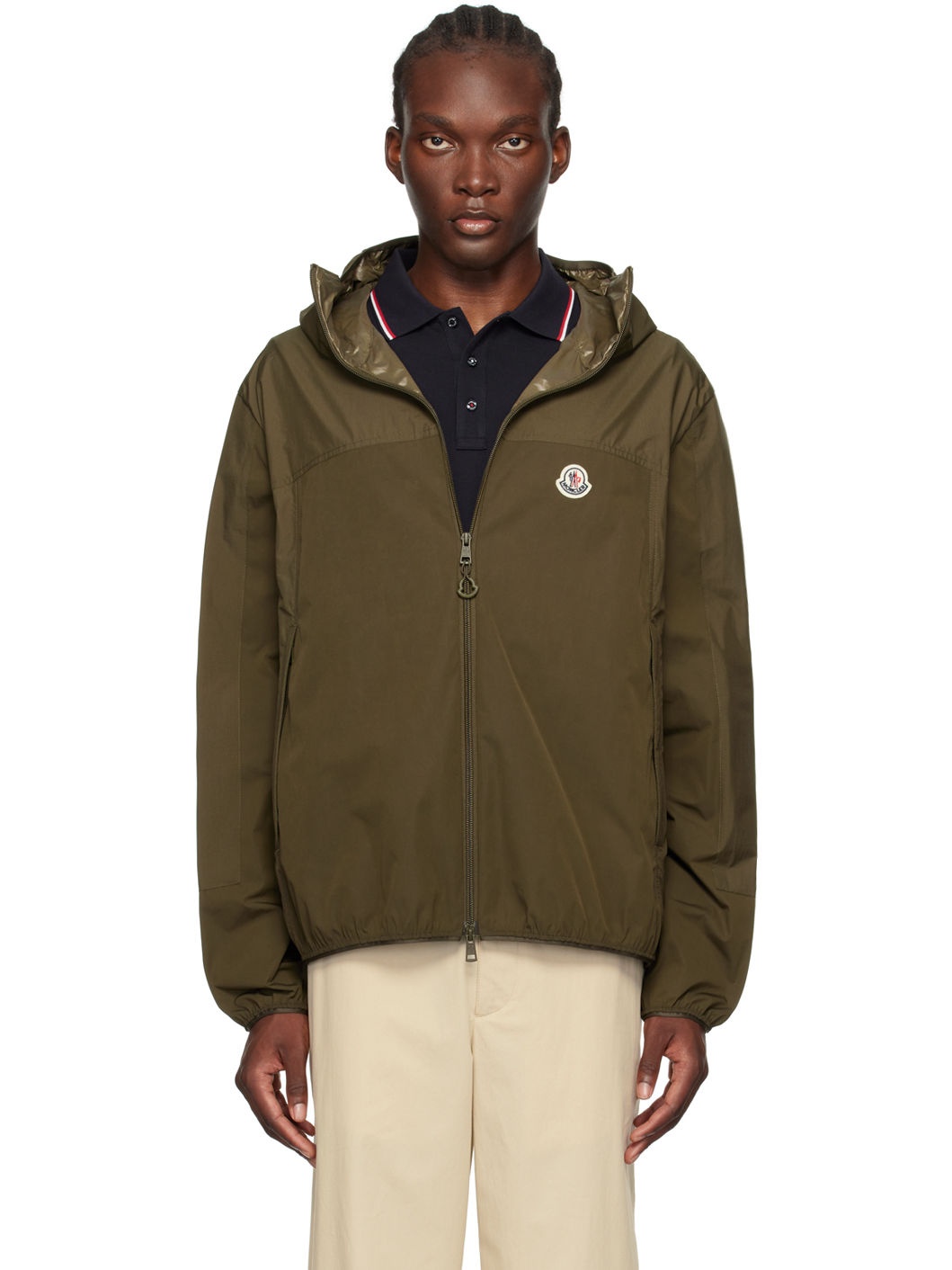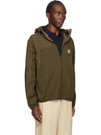 Polyester taffeta and nylon- and cupro-blend ripstop jacket. · Paneled construction · Elasticized trim and bungee-style drawstring at hood · Funnel neck · Two-way zip closure · Felted logo patch at chest · Zip pockets · Elasticized trim at hem and cuffs · Partial laque lining · Logo-engraved black hardware Supplier color: Dark olive green Body 1: 100% polyester. Body 2: 89% polyamide, 11% cupro. Lining: 100% polyamide. Made in Romania 242111M180016