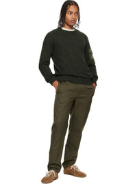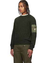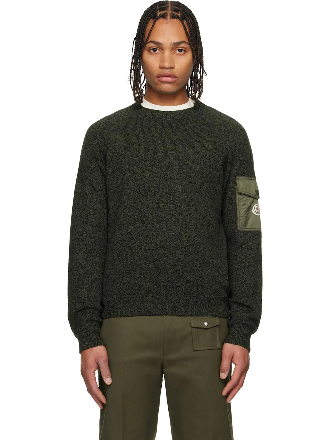 7-gauge knit virgin wool-blend sweater. · Rib-knit crewneck, hem, and cuffs · Flap pocket with felted logo patch at sleeve Supplier color: Dark olive Body: 90% virgin wool, 10% cashmere. Trim: 100% polyamide. Made in Moldova 252111M201016
