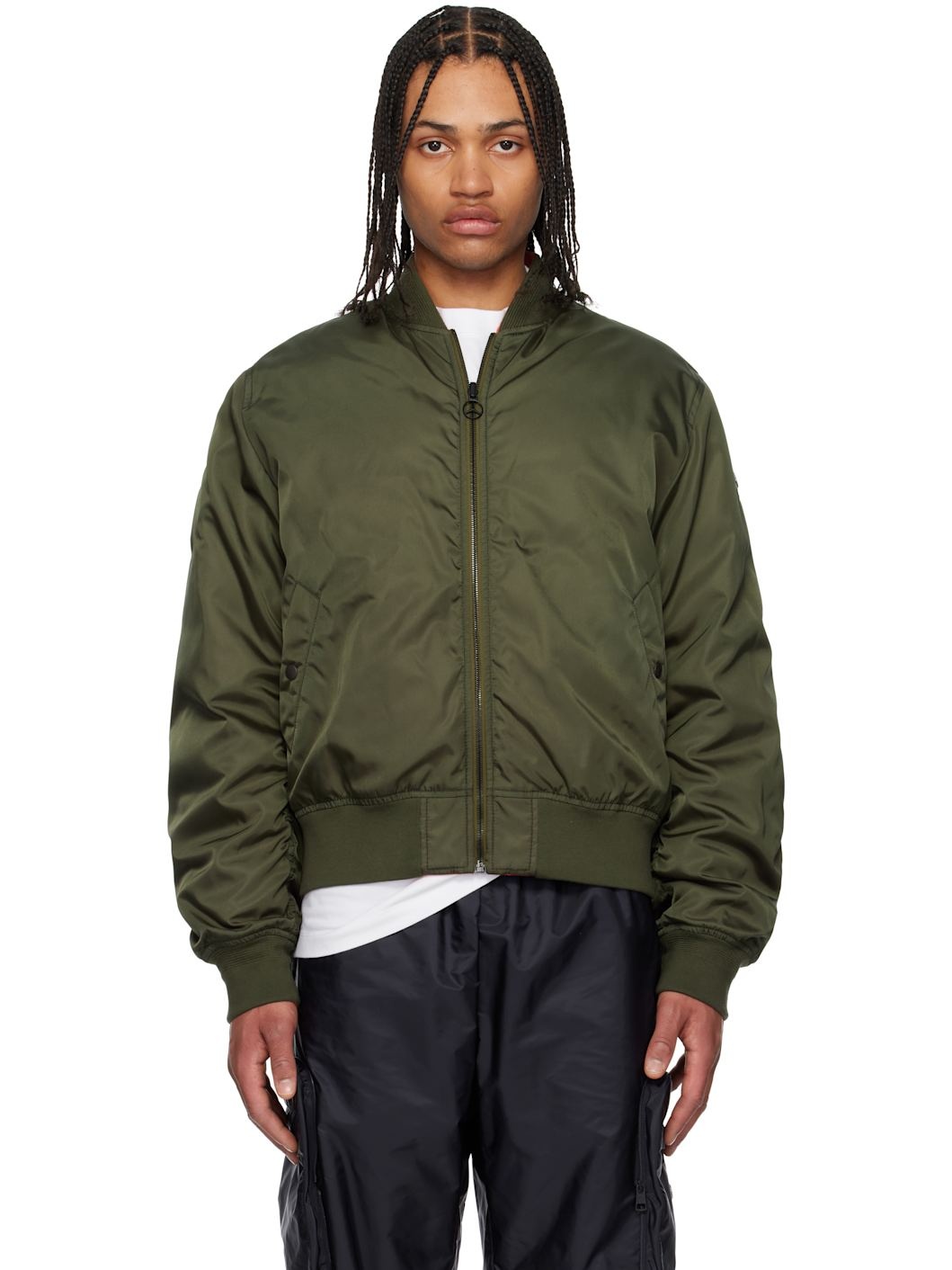 Reversible down-filled nylon gabardine bomber jacket. Reverse in orange quilted nylon taffeta. Felted logo patch at sleeve. · Rib-knit stand collar, hem, and cuffs · Logo charm at zip closure · Welt pockets · Logo patch with hardware at sleeve · Jacquard logo at back hem · Welt pockets at interior · Logo-engraved black hardware Part of the Moncler Genius x Mercedes-Benz by NIGO collaboration. Supplier color: Urban olive green Fill: 90% goose down, 10% feather. Body: 100% polyamide. Trim: 100% polyester. Lining: 100% polyamide. Made in Italy 252171M175000