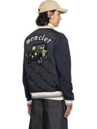 Insulated cotton jersey and quilted nylon taffeta cardigan. · Striped rib-knit V-neck, hem, and cuffs · Button closure · Felted logo patch with hardware at chest · Welt pockets · Logo and graphic embroidered at back · Full nylon taffeta lining · Logo-engraved navy hardware Part of the Moncler Genius x Mercedes-Benz by NIGO collaboration. Supplier color: Peacot Body 1: 100% cotton. Body 2: 100% polyamide. Fill: 100% polyester. Lining: 100% polyamide. Made in Turkey 252171M200000