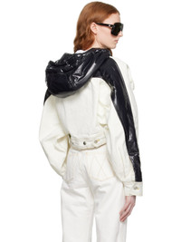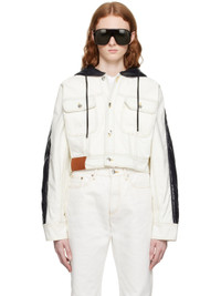 Paneled non-stretch bleached denim and padded nylon satin jacket. · Drawstring at hood · Button closure · Flap pockets · Leather logo patch at front hem · Embroidered logo patch at sleeve · Single-button barrel cuffs · Adjustable button-tabs at back hem · Contrast stitching in yellow Part of the Moncler Genius x Alicia Keys collaboration. Supplier color: White Body: 100% cotton. Fill: 70% polyethylene, 30% polyester. Lining: 100% polyamide. Trim: 100% polyamide. Made in Italy 231171F063004