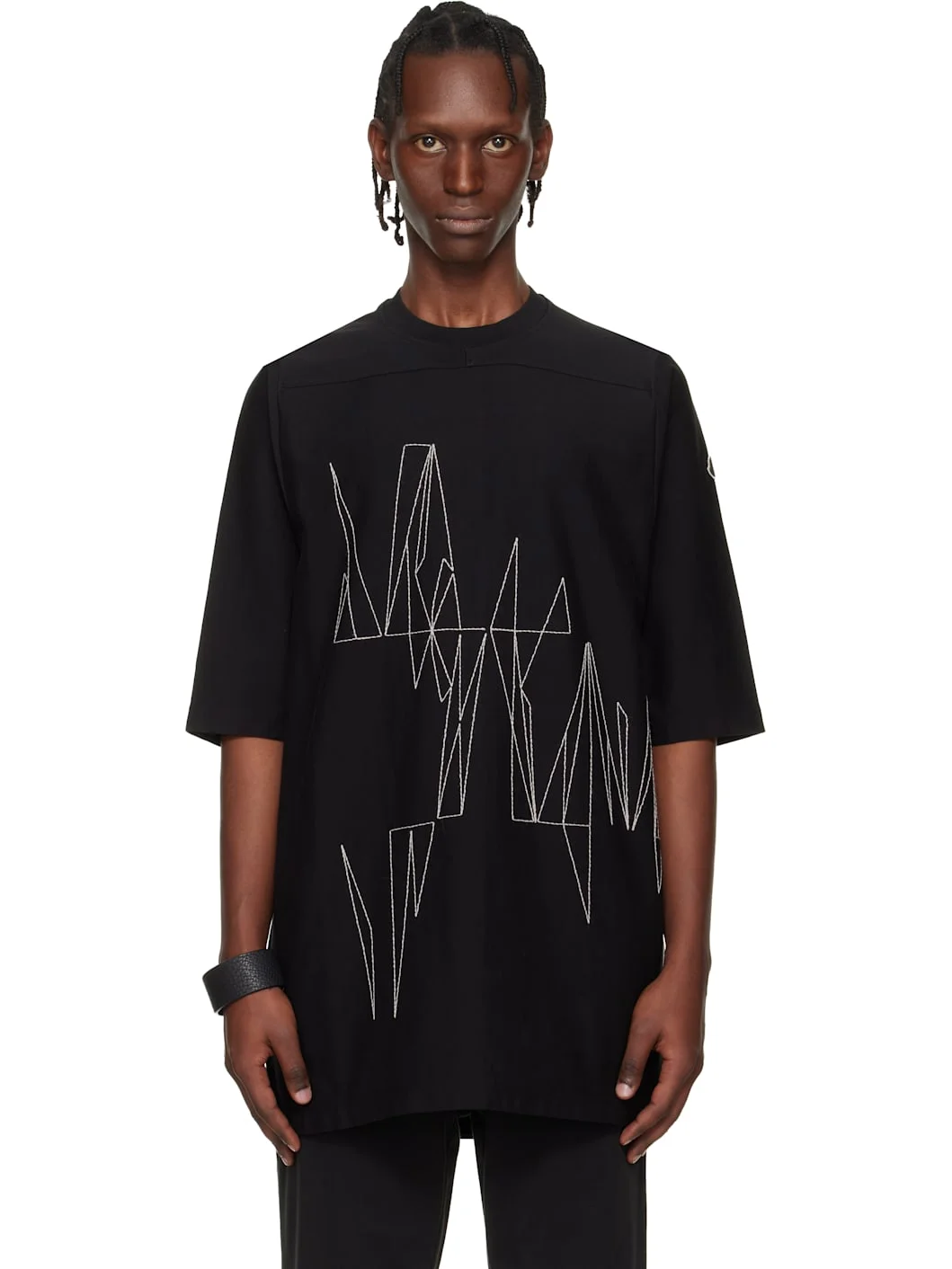 Cotton jersey T-shirt. · Paneled construction · Loose-fit · Rib-knit crewneck · Graphics stitched at front and back · Logo patch at sleeve · Central seam at back Part of the Moncler + Rick Owens collaboration. Supplier color: Black 100% cotton. Made in Turkey 261232M213000