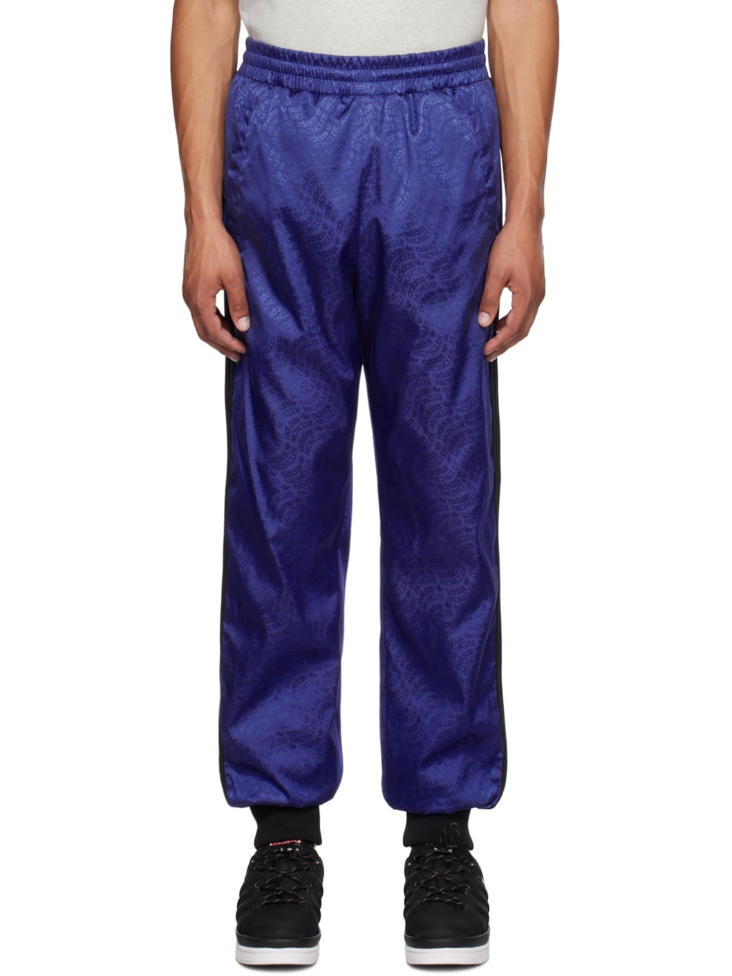 Down-filled nylon twill trousers. Logo pattern throughout. · Concealed drawstring at elasticized waistband · Two-pocket styling · Rib knit cuffs · Jersey stripes at outseams · Rubberized logo patch at outseam · Rubberized logo applique at back · Full quilted satin lining Part of the Moncler Genius x adidas Originals collaboration. Supplier color: Blue Fill: 90% goose down, 10% feathers. 100% polyamide. Made in Romania 232171M191000