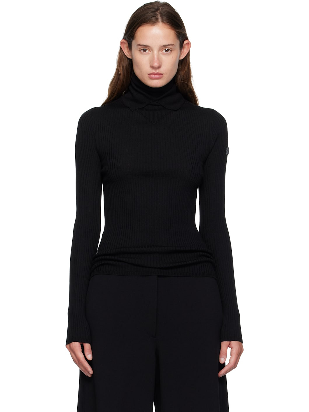18-gauge rib-knit virgin wool turtleneck. Leather logo patch at sleeve. Part of the Moncler Genius x EE72 by Edward Enninful collaboration. Supplier color: Black 100% virgin wool. Made in Italy 252171F099001