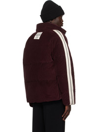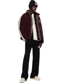 Down-filled quilted cotton corduroy jacket. · DIST-certified down · Stand collar · Zip closure · Boucle logo patch at chest · Zip pockets · Bungee-style drawstring at hem · Striped knit trim at sleeves · Elasticized cuffs · Full nylon satin lining Part of the Moncler Genius x Palm Angels collaboration. Supplier color: Maroon Fill: 90% goose down, 10% feather. Body: 100% cotton. Trim: 100% cotton. Lining: 100% polyamide. Made in Romania 242171M178007