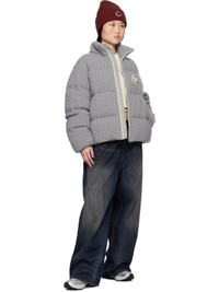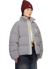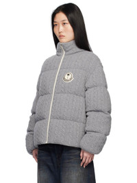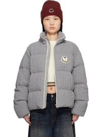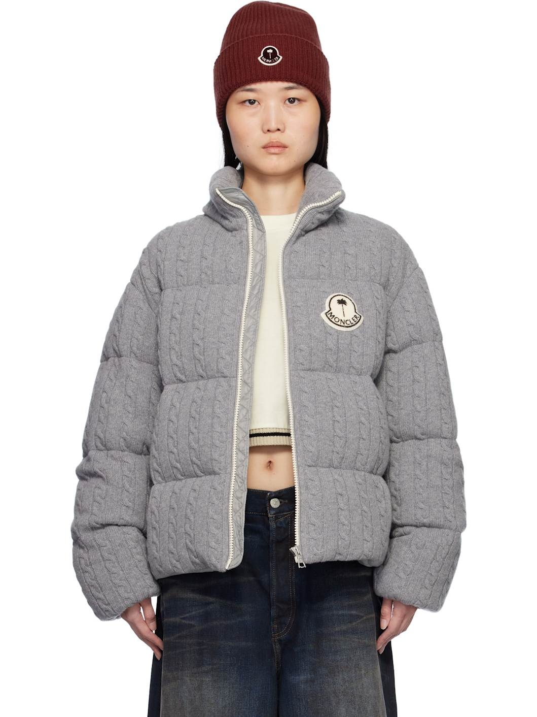 Down-filled and quilted cable knit virgin wool jacket. · DIST-certified down · Funnel neck · Zip closure · Logo applique at chest and back · Zip pockets · Concealed bungee-style drawstring at hem · Elasticized cuffs · Full nylon satin lining · Logo-engraved silver-tone hardware Part of the Moncler Genius x Palm Angels collaboration. Supplier color: Gray Down: 90% down, 10% feather. Body: 100% virgin wool. Lining: 100% polyamide. Made in Italy 242171F061001