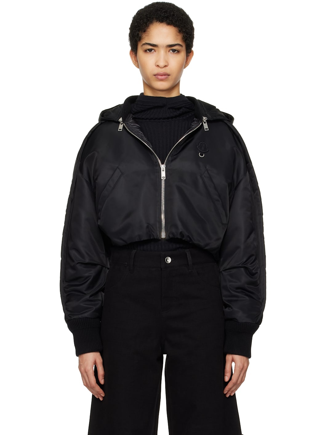 DIST-certified down-filled nylon taffeta jacket. · Grommets at detachable hood · Rib-knit stand collar and cuffs · Zip closure · Embroidered logo patch with O-ring at chest · Welt pockets · Elasticized cropped hem · Dropped shoulders · Ruching at sleeves and back · Full quilted lining · Logo-engraved silver-tone hardware Part of the Moncler Genius x Willow Smith collaboration. Supplier color: Black Fill: 90% goose down, 10% goose feather. Body: 100% nylon. Lining 1: 100% polyester. Lining 2: 100% nylon. Made in Italy 251171F061004