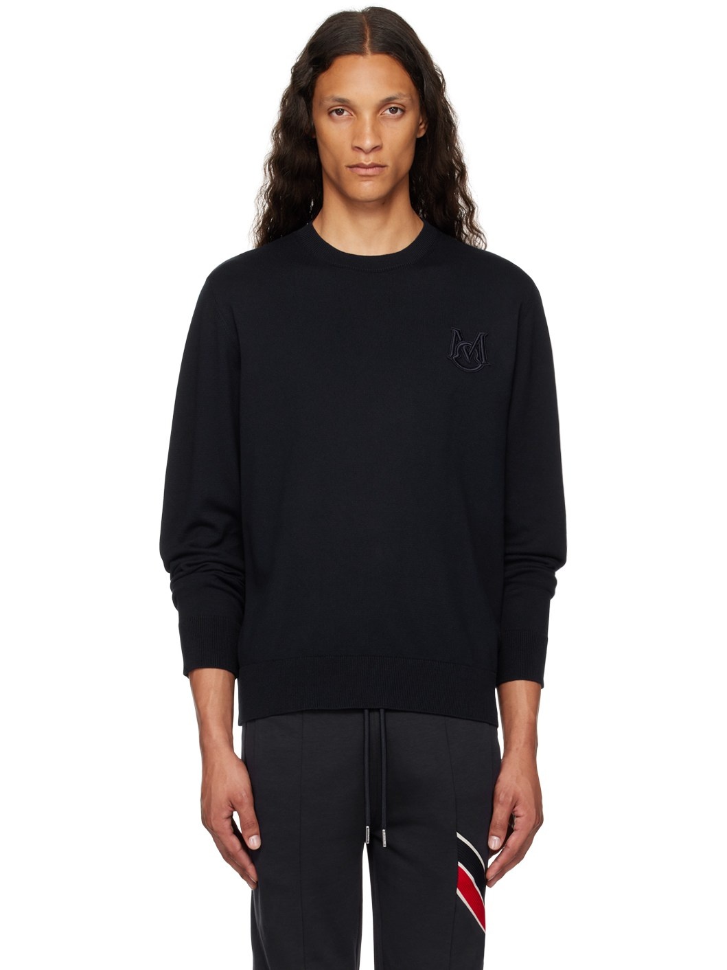 Knit cotton sweater. · Rib knit crewneck, hem, and cuffs · Logo graphic applique at chest · Tricolor felted logo patch at sleeve Supplier color: Navy blue 100% cotton. Made in Bulgaria 242111M201008
