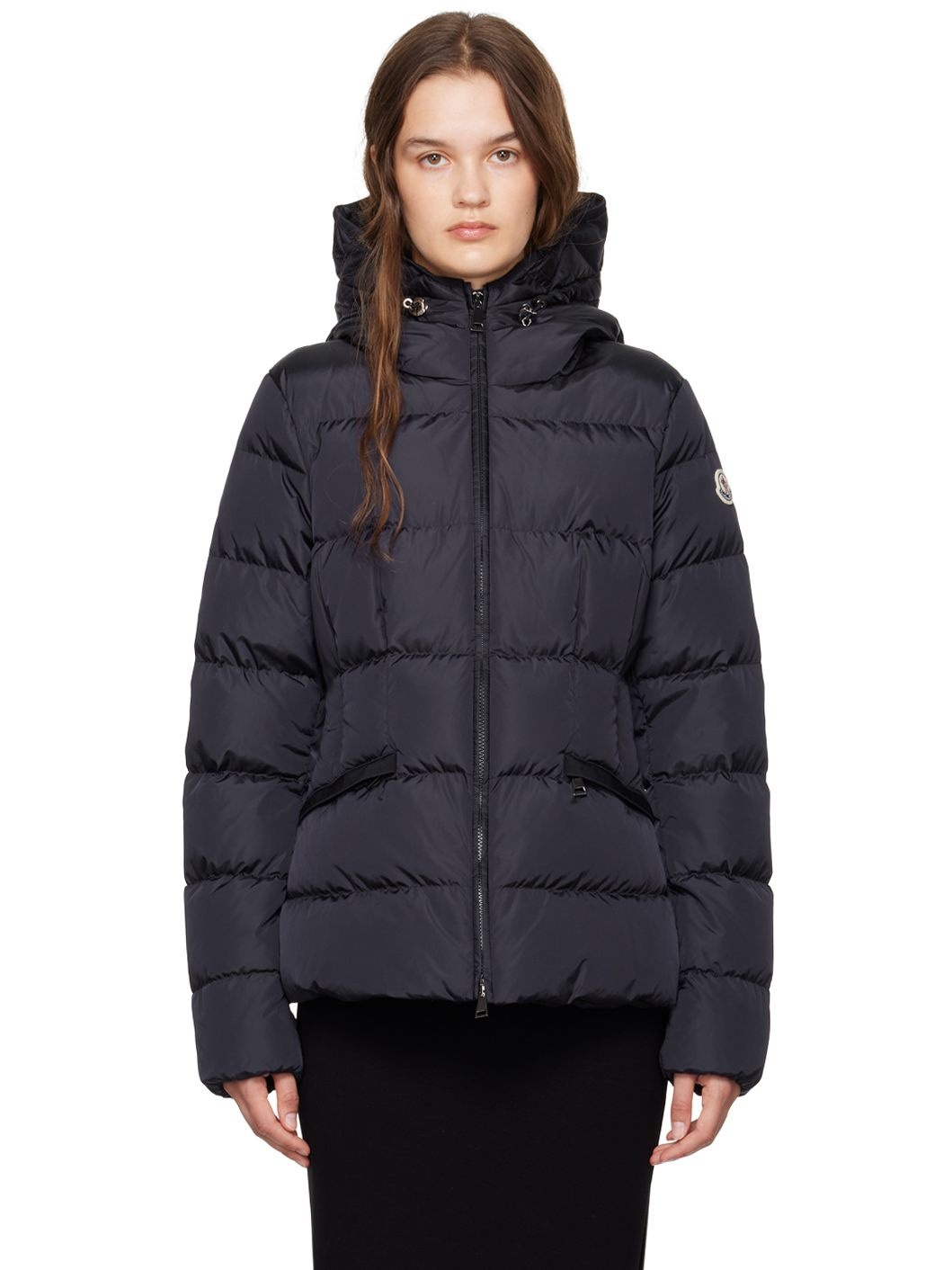 DIST-certified down-filled and quilted recycled nylon taffeta jacket. · Bungee-style drawstring at hood · Stand collar · Two-way zip closure · Darts at front · Zip pockets · Tricolor felted logo patch at sleeve · Elasticized cuffs and back waist · Full nylon longue saison lining Supplier color: Night blue Fill: 90% down, 10% feather. 100% polyamide. Made in Armenia 242111F061090