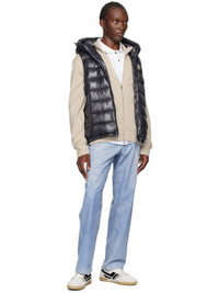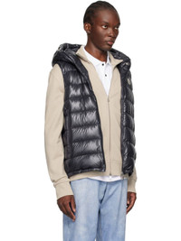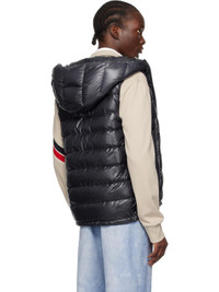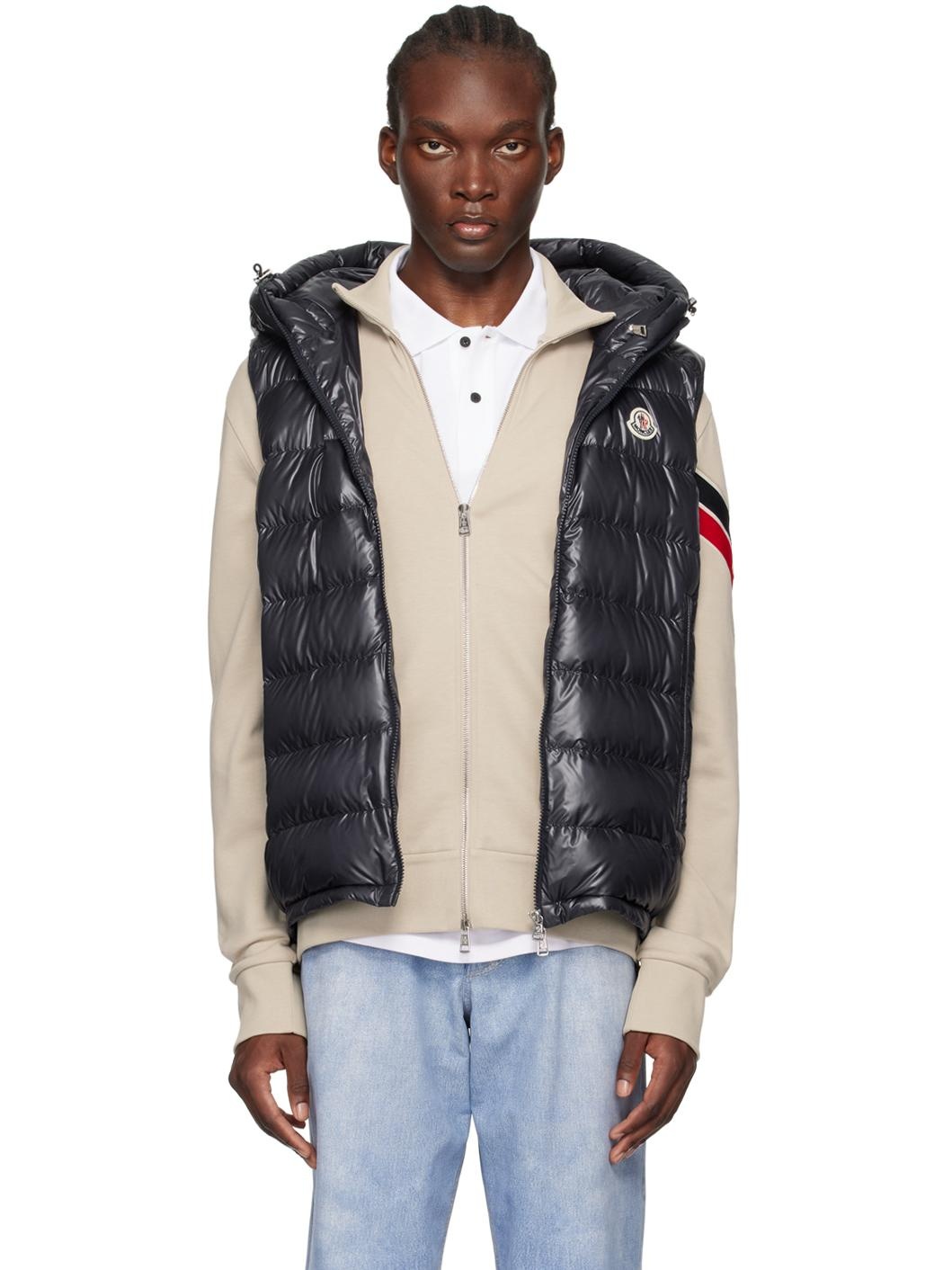 Padded and quilted polyester satin vest. Logo-embroidered grosgrain trim at packable nylon taffeta hood. · Bungee-style drawstring at DIST-certified down-filled hood · Two-way zip closure · Felted logo patch at chest · Zip pockets · Elasticized hem · Zip pocket at interior · Full water-repellent satin lining · Logo-engraved silver-tone hardware Supplier color: Navy blue Fill 1: 90% goose down, 10% goose feather. Body: 100% polyester. Trim: 100% polyamide. Fill 2: 100% polyester. Lining 1: 100% polyester. Lining 2: 100% polyester. Made in Armenia 242111M178074