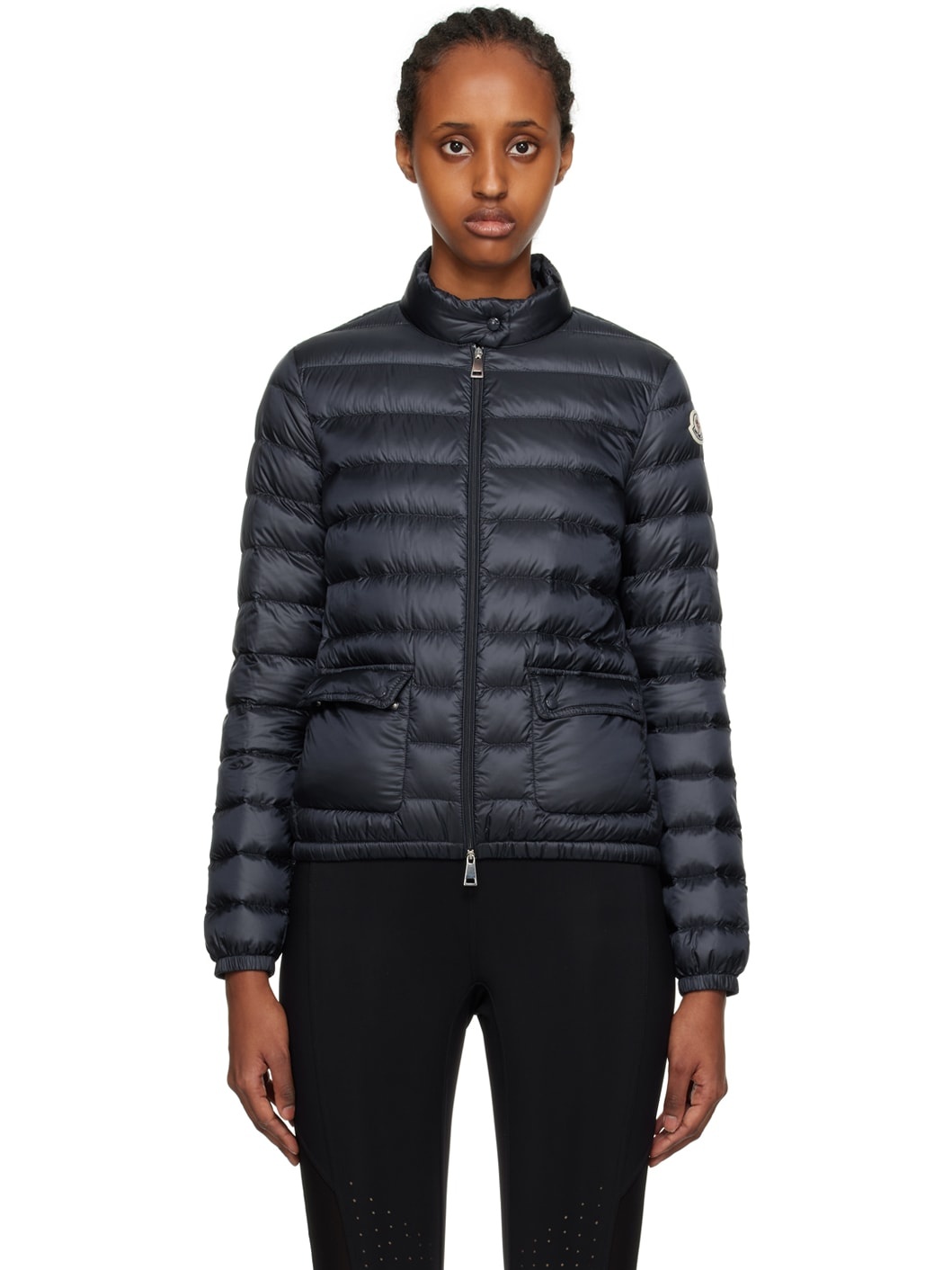 Packable quilted down-filled nylon leger jacket. · Press-stud fastening at stand collar · Two-way zip closure · Flap pockets · Tricolor felted logo patch at sleeve · Fully lined · Logo-engraved hardware Supplier color: Blue navy Fill: 90% goose down, 10% feathers. Body: 100% polyamide. Lining: 100% polyamide. Made in Bulgaria 232111F061019