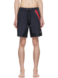 Nylon taffeta swim shorts. · Drawstring at elasticized waistband · Three-pocket styling · Striped trim and logo patch at leg · Full mesh lining Supplier color: Dark navy blue 100% polyamide. Made in Albania 242111M208005