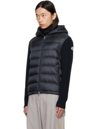 Double-faced knit wool hoodie. · Quilted down-filled satin front and hood · DIST-certified down and feathers · Two-way zip closure · Zip pockets at waist · Embroidered logo patch at sleeve · Rib-knit cuffs · Unlined Supplier color: Obsidian Blue Fill: 90% down, 10% feathers. Body 1: 100% nylon. Body 2: 100% wool. Made in Moldova 252111M178007