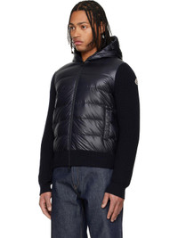Down-filled and quilted satin and knit virgin wool jacket. · DIST-certified down · Seven-gauge knit · Paneled construction · Two-way zip closure · Welt pockets at waist · Rib-knit hem and cuffs · Felted logo patch at sleeve · Partial quilted satin lining Supplier color: Navy blue Body 1: 100% polyester. Body 2: 100% virgin wool. Fill: 90% goose down, 10% feather. Lining: 100% polyester. Made in Turkey 252111M178057