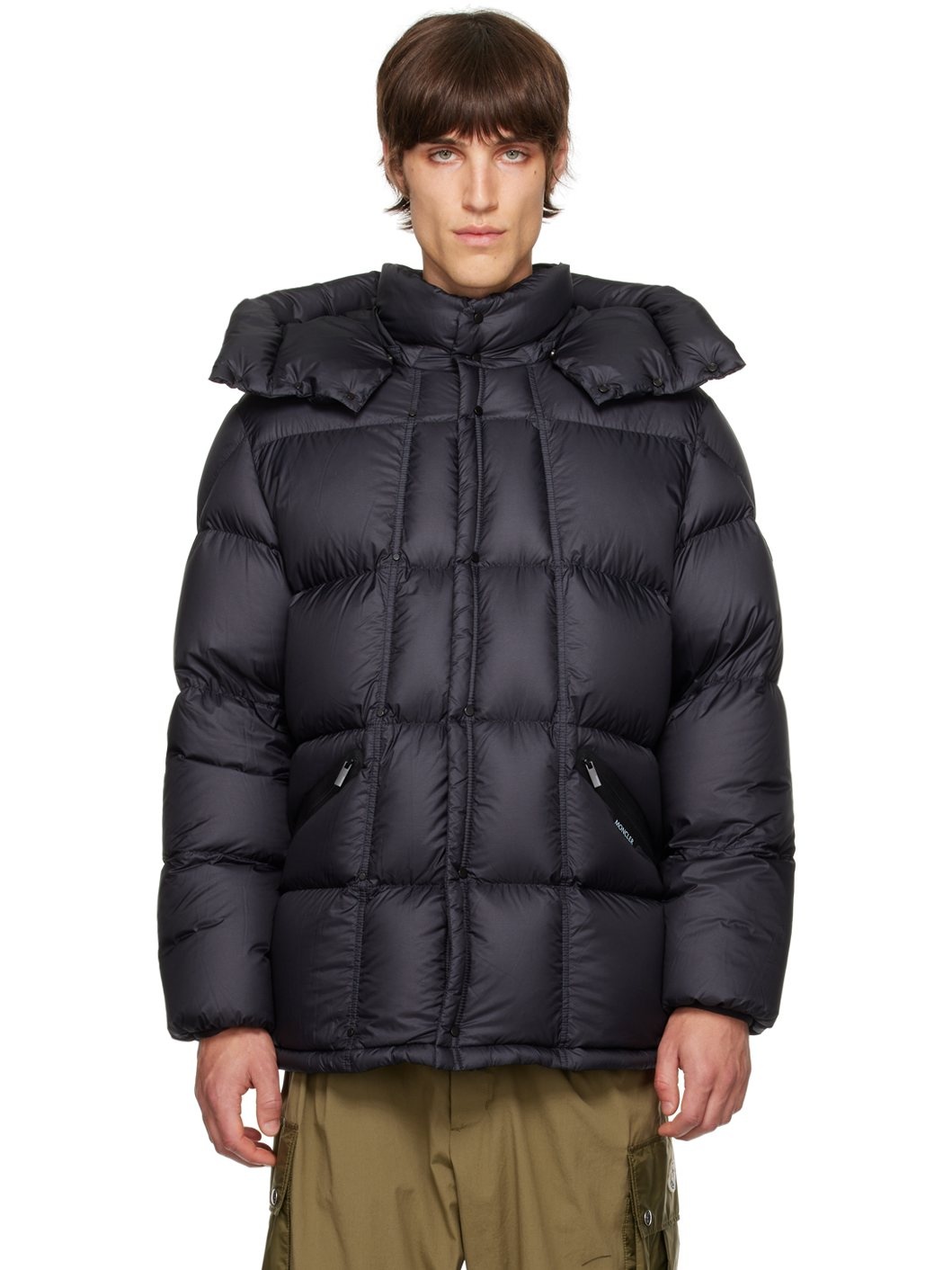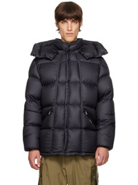 Down-filled quilted nylon jacket. · Detachable hood · Stand collar · Two-way zip closure with press-stud placket · Zip pockets · Concealed bungee-style drawstring at hem · Rubberized logo patch at sleeve · Elasticized cuffs · Full polyester taffeta lining Supplier color: Dark navy blue Fill: 90% goose down, 10% feather. Body: 100% polyamide. Lining: 100% polyester. Made in Romania 242111M178118