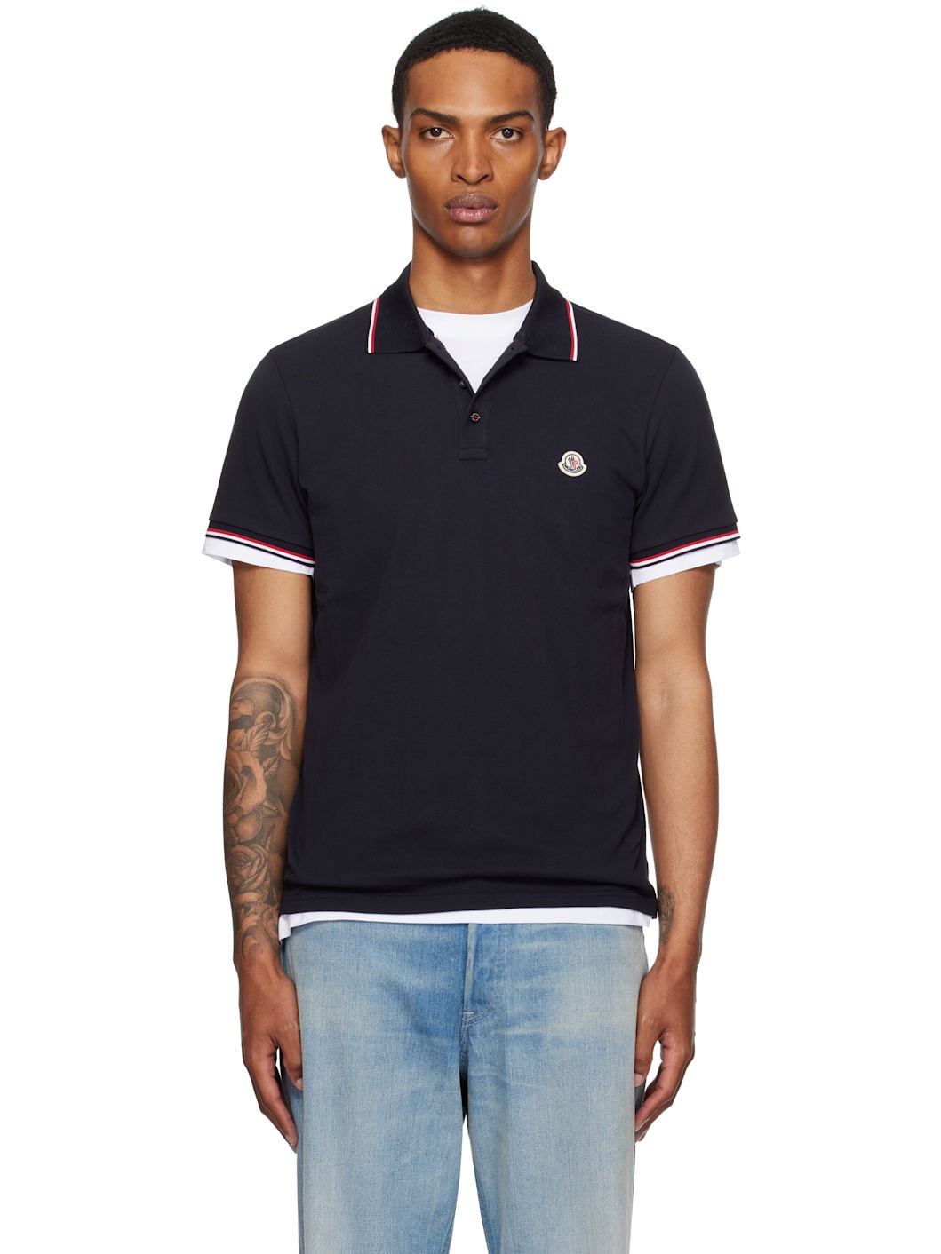 Cotton pique polo. · Striped rib-knit spread collar and cuffs · Three-button placket · Felted logo patch at chest · Tennis-tail hem Supplier color: Dark blue 100% cotton. Made in Turkey 252111M212009