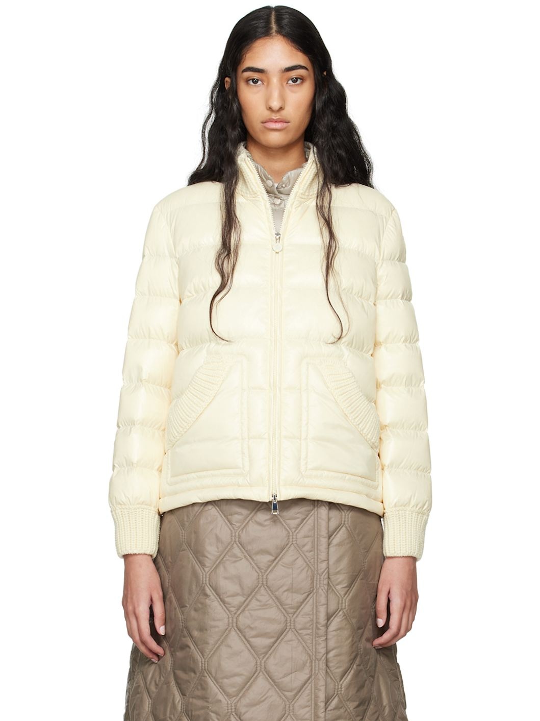 Lightweight and water-repellent DIST-certified down-filled quilted nylon laque jacket. · Rib knit stand collar, hem, and cuffs · Two-way zip closure · Patch pockets · Bungee-style drawstring at hem · Tricolor felted logo patch at sleeve · Fully lined Supplier color: Spanish white Fill: 90% goose down, 10% feather. 100% polyamide. Made in Romania 242111F061035