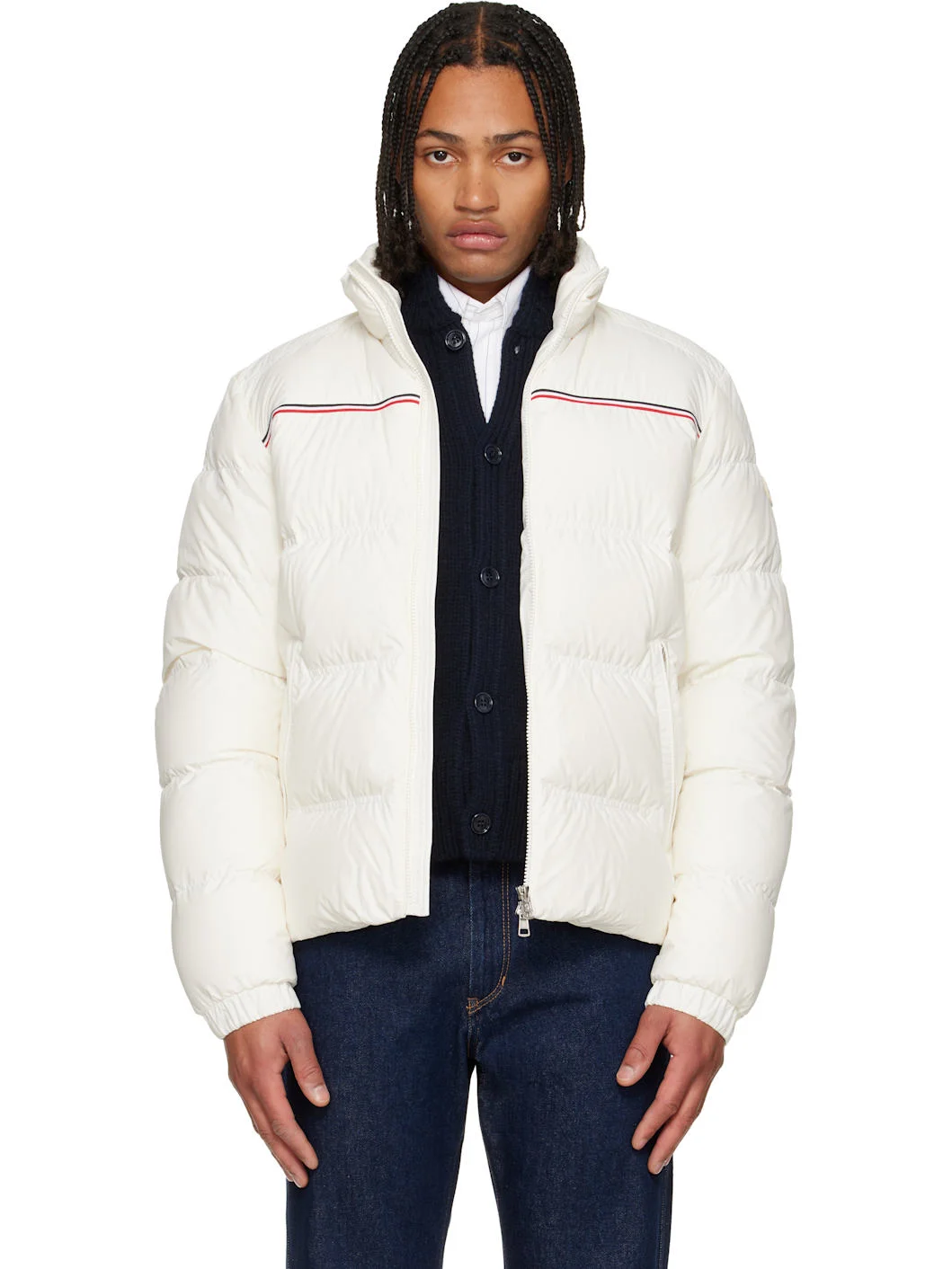 Down-filled and quilted taffeta jacket. · DIST-certified down · Stand collar · Two-way zip closure · Tricolor piping at chest · Zip pockets at front · Bungee-style drawstring at hem · Felted logo patch at sleeve · Elasticized cuffs · Zip pocket at interior · Fully lined Supplier color: Silk white Body: 100% polyester. Fill: 90% goose down, 10% feather. Lining: 100% polyester. Made in Romania 252111M178094