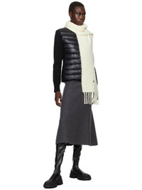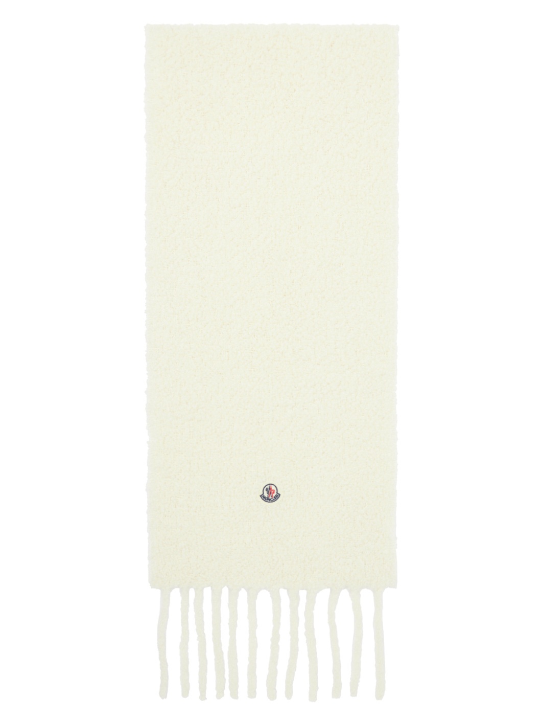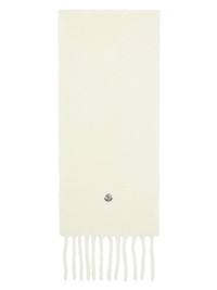 Rectangular boucle knit alpaca-blend scarf in off-white. · Felted logo patch at face · Fringed detailing at ends · H80" x W11.5" Supplier color: Off-White 90% alpaca, 10% polyamide. Made in Italy 242111F028006