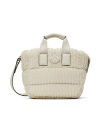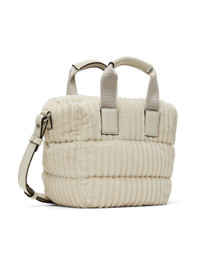 Down-filled quilted polyester terrycloth tote in off-white. · Buffed calfskin trim throughout · Rolled carry handles · Adjustable and detachable crossbody strap · Logo hardware at face · Zip closure · Patch pocket at interior · Twill lining · H7" x W8.5" x W5" Supplier color: 20N Fill: 90% goose down, 10% goose feather. Body: 100% polyester. Trim: 100% calfskin. Lining: 95% cotton, 5% acrylic. Made in Italy 242111F049012