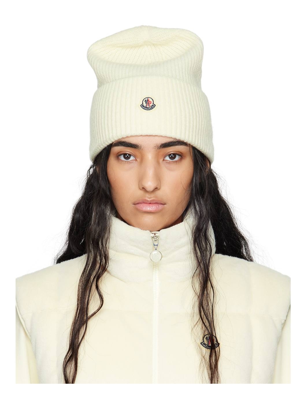 7-gauge rib knit virgin wool beanie in off-white. Felted logo patch at rolled brim. Supplier color: Gardenia 100% virgin wool. Made in Italy 242111F014007