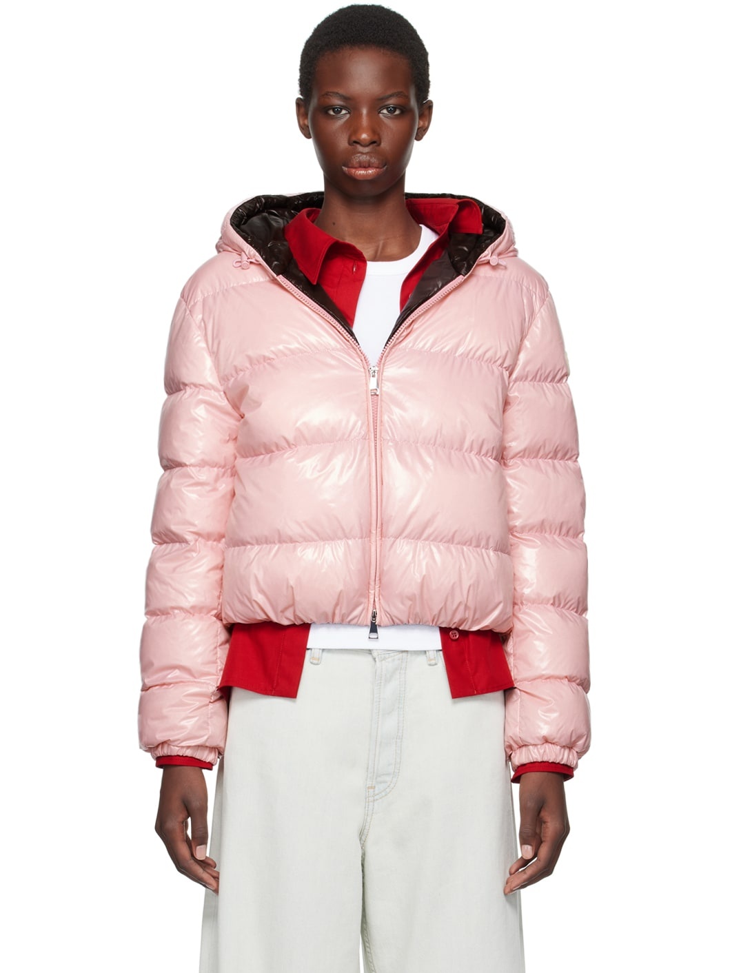 Down-filled quilted nylon laque jacket. Water-repellent. · Bungee-style drawstring at hood · Zip closure · Zip pockets · Elasticized hem and cuffs · Tricolor felted logo patch at sleeve Supplier color: Pink/Brown Fill: 90% down, 10% feather. Body: 100% polyamide. Lining: 100% polyamide. Made in Romania 242111F061079