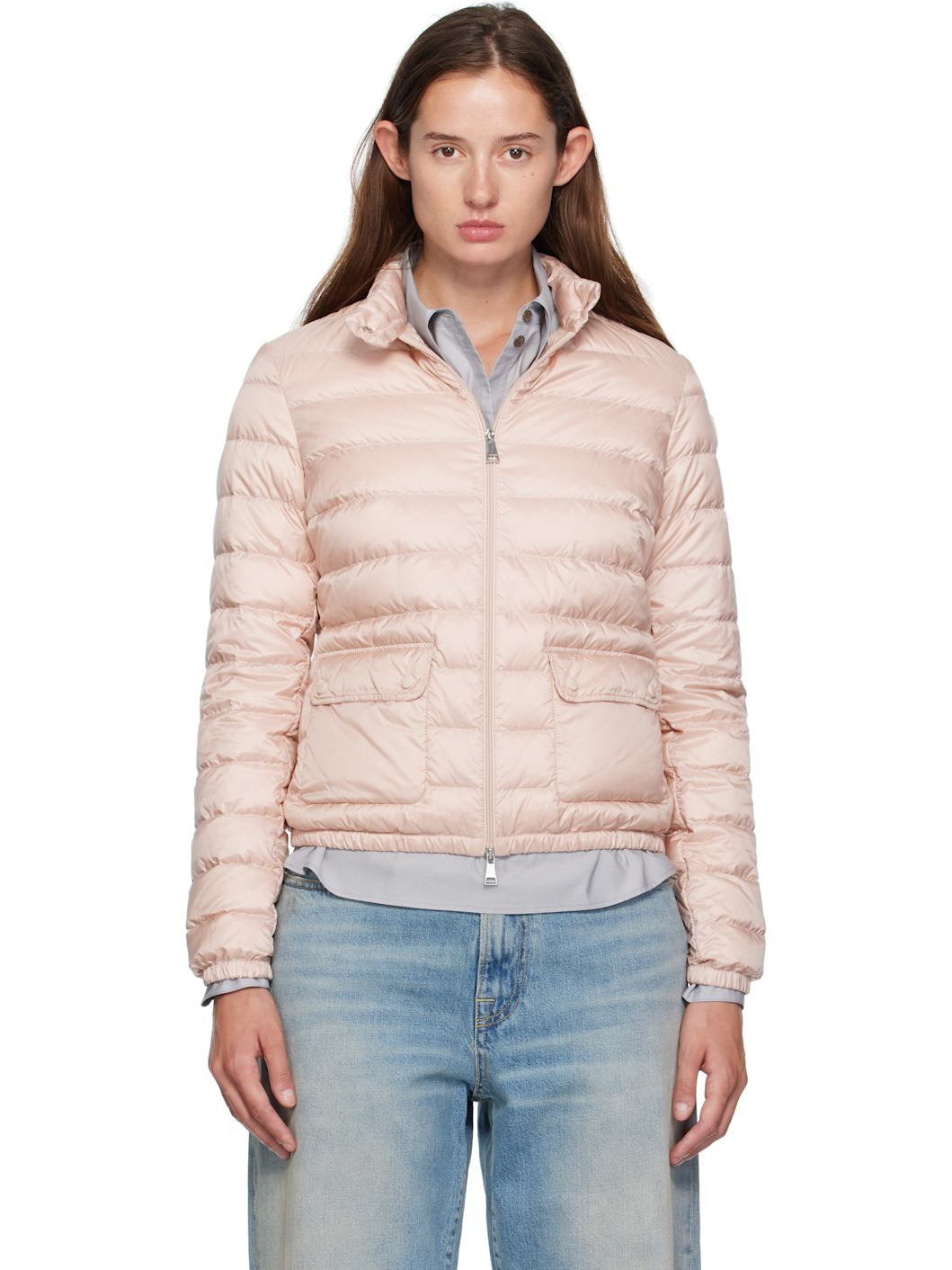 Lightweight down-filled quilted nylon leger jacket. Packable. · DIST-certified down · Press-stud fastening at stand collar · Two-way zip closure · Press-stud flap pockets at waist · Elasticized hem and cuffs · Tricolor felted logo patch at sleeve · Fully lined Supplier color: Light pink Fill: 90% goose down, 10% feather. Body: 100% polyamide. Made in Moldova 252111F061009