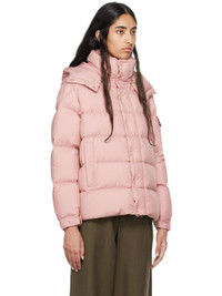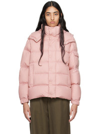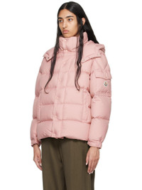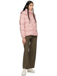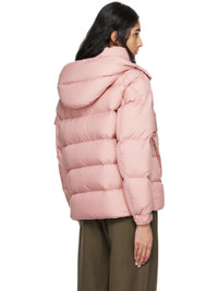 Down-filled quilted recycled polyester taffeta jacket. · Bungee-style drawstring and press-stud fastening at detachable hood · Stand collar · Two-way zip closure with press-stud placket · Zip pockets · Concealed bungee-style drawstring at hem · Patch pocket and tricolor felted logo patch at sleeve · Adjustable press-stud tab at elasticized cuffs · Zip pocket at interior · Full recycled polyester taffeta lining Part of the 70th anniversary collection. Supplier color: Pink Fill: 90% down, 10% feather. Body: 100% polyester. Lining: 100% polyester. Made in Moldova 242111F061072
