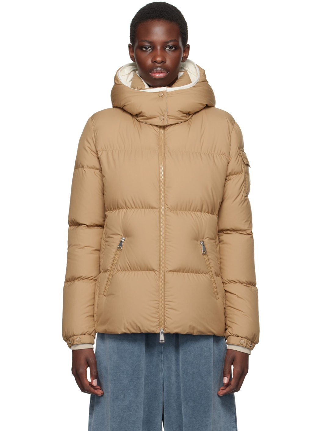 Down-filled and quilted recycled polyester taffeta jacket. Water repellent. · Bungee-style drawstring at detachable hood · Stand collar · Two-way zip closure · Zip pockets · Flap pocket and felted logo patch at sleeve · Adjustable press-stud tab at elasticated cuffs · Full recycled polyester taffeta lining Supplier color: Light beige Fill: 90% goose down, 10% feather. Body: 100% recycled polyester. Lining: 100% recycled polyester. Made in Moldova 242111F061075