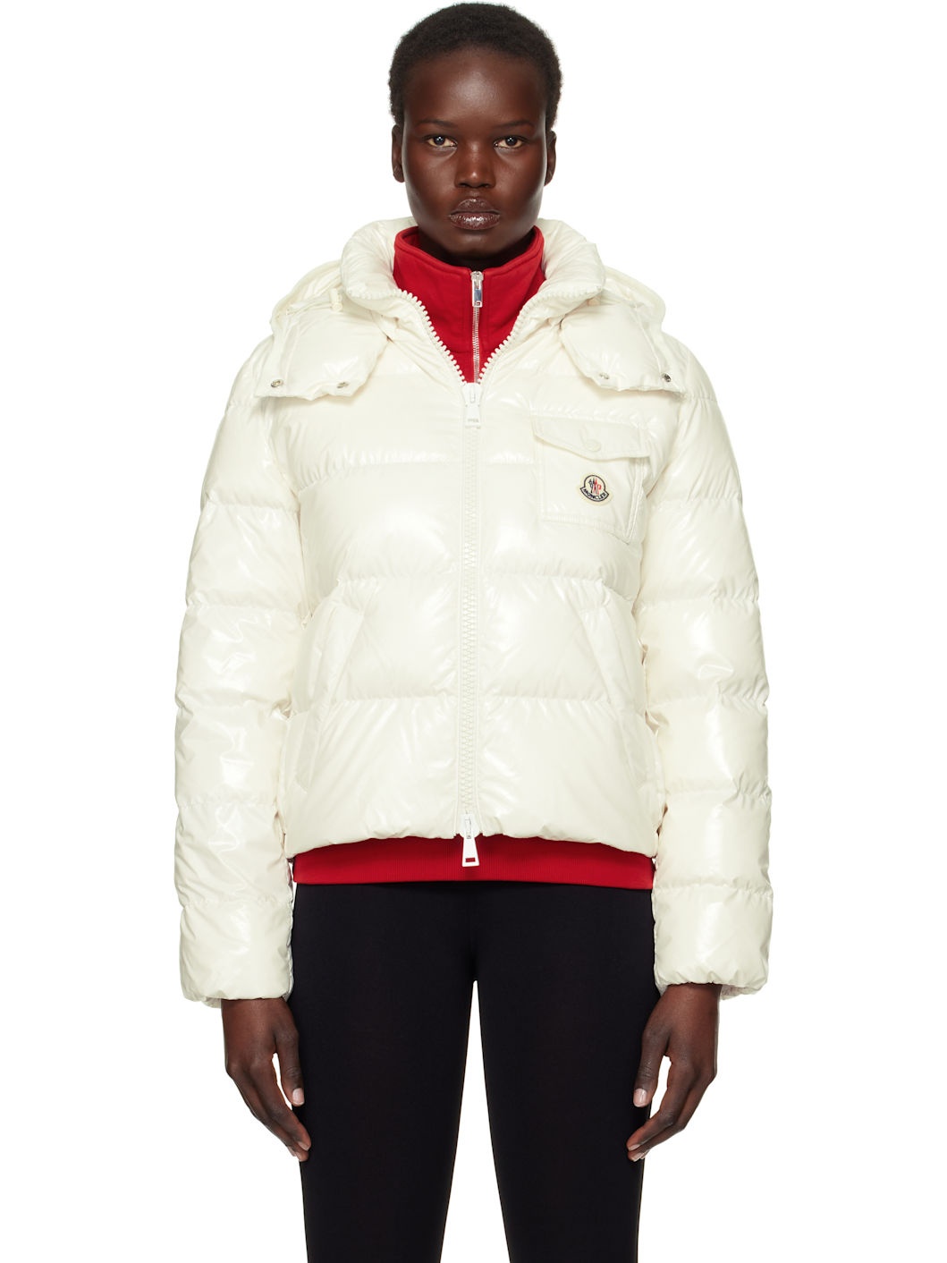 DIST-certified down-filled and quilted coated nylon satin jacket. · Bungee-style drawstring at detachable hood · Stand collar · Two-way zip closure · Felted logo patch at flap pocket · Zip pockets · Partially elasticized hem · Elasticized cuffs · Full longue saison lining Supplier color: Silk white Fill: 90% goose down, 10% feathers. Body: 100% polyamide. Lining: 100% polyamide. Made in Romania 251111F061012