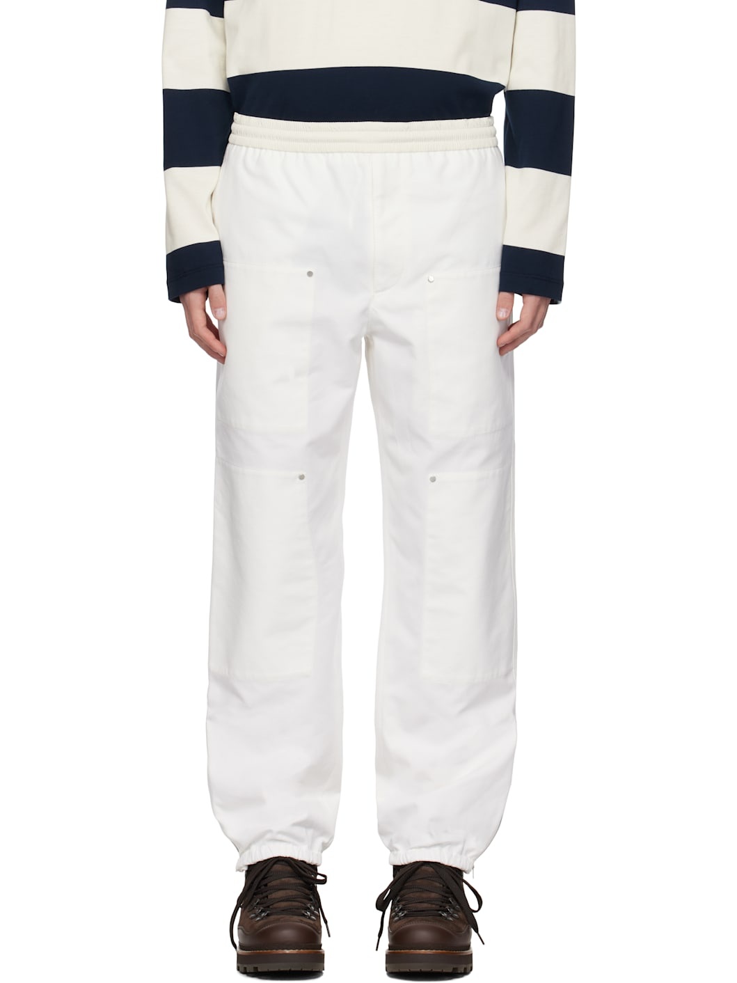 Cotton- and nylon-blend canvas trousers. Rivets throughout. · Concealed drawstring at elasticized waistband · Three-pocket styling · Zip-fly · Zip vent at elasticized cuffs · Embroidered logo at back patch pocket · Logo-engraved silver-tone hardware Supplier color: White Body: 59% cotton, 41% nylon. Trim: 100% polyester. Made in Romania 242111M190015