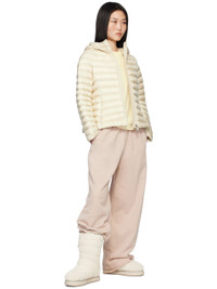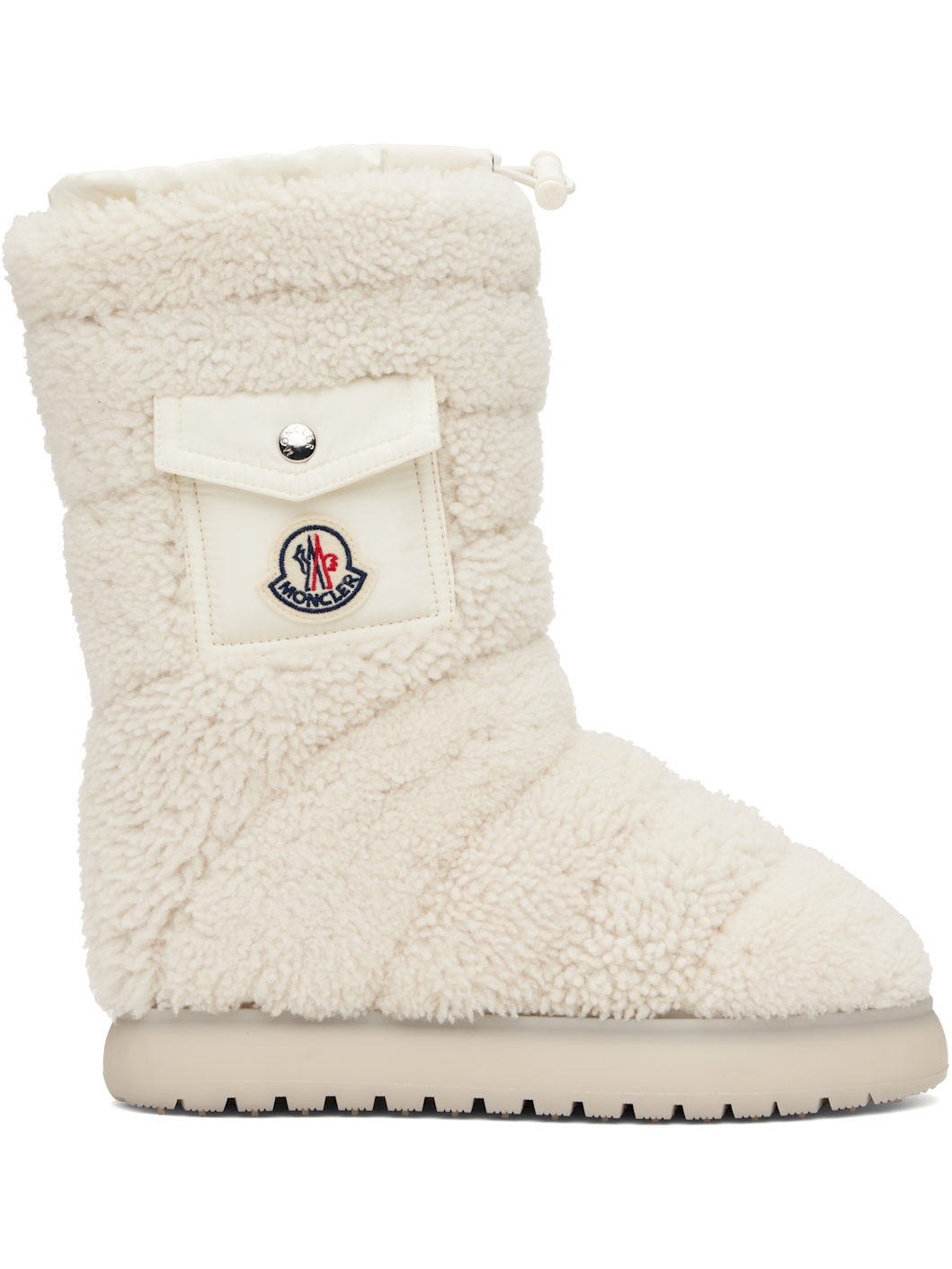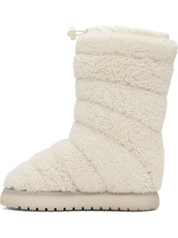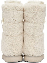 Mid-calf down-filled and quilted shearling boots in white. · Bungee-style drawstring at collar · Flap pocket at outer side · Tricolor felted logo patch · Waterproof and quilted nylon satin lining · Treaded rubber sole Supplier color: White Fill: 90% down, 10% feather. Upper: leather. Sole: rubber. Made in Italy 242111F114003
