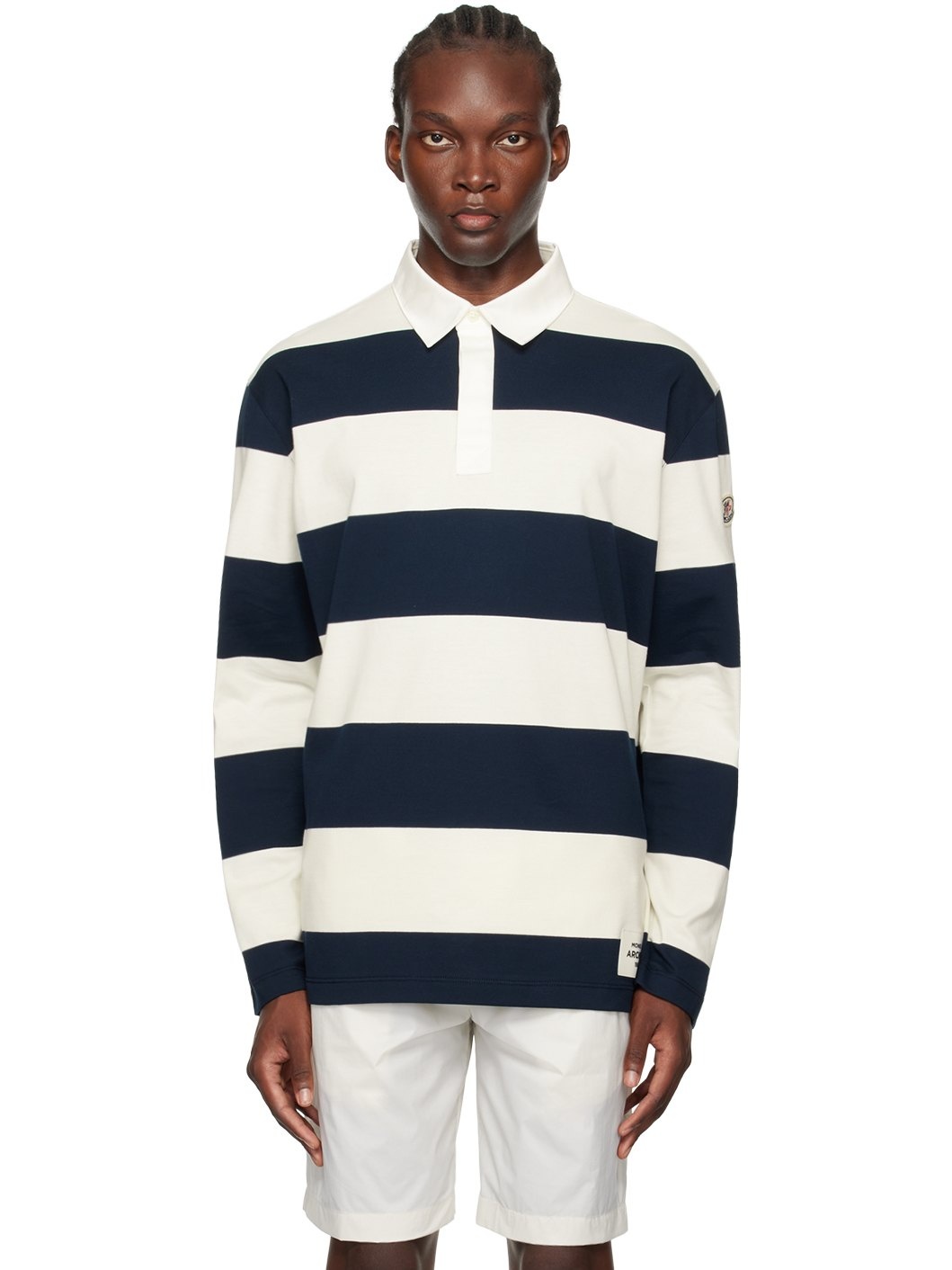 Cotton jersey polo. Stripes throughout. · Twill spread collar · Concealed three-button packet · Rubberized logo patch at tennis-tail hem · Felted logo patch at sleeve Supplier color: Dark navy blue/White 100% cotton. Made in Turkey 242111M212008