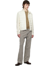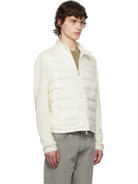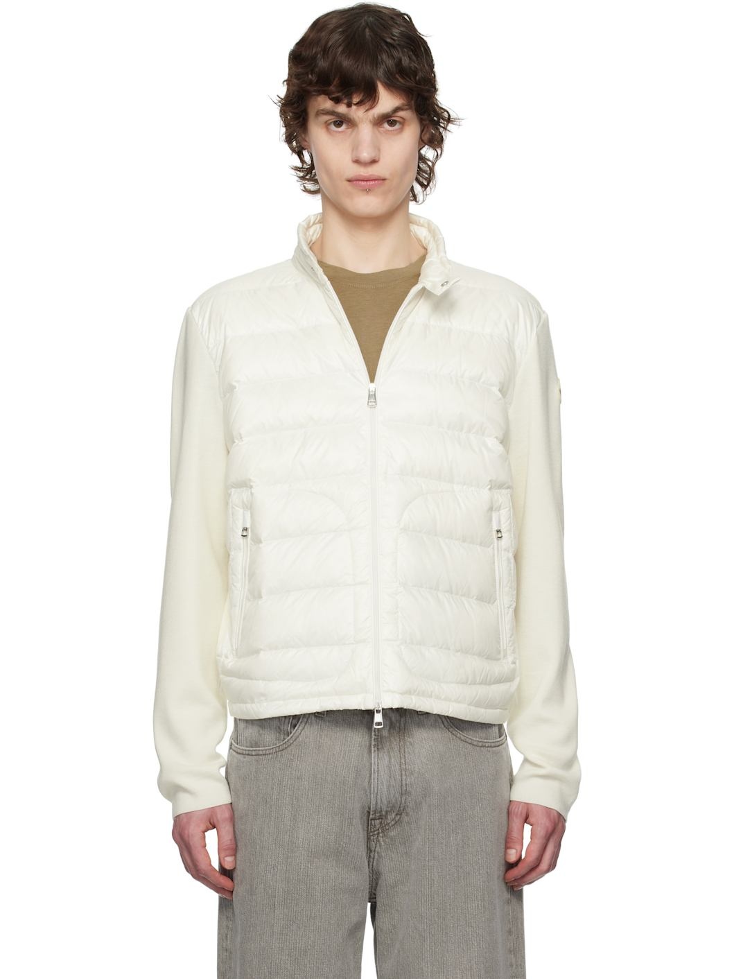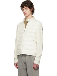 Down-filled and quilted nylon satin jacket. 12-gauge rib-knit virgin wool sleeves and back. · DIST-certified down · Paneled construction · Press-stud fastening at stand collar · Two-way zip closure · Zip pockets · Felted logo patch at sleeve · Logo-engraved silver-tone hardware Supplier color: Bright white Fill: 90% down, 10% feather. Body 1: 100% nylon. Body 2: 100% virgin wool. Lining: 100% nylon. Made in Moldova 251111M178004